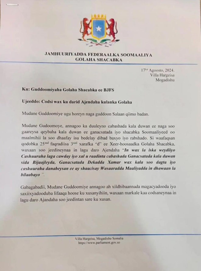 Sabti, Agoosto, 17, 2024 (HOL) - Xildhibaano katirsan Baarlamaanka ayaa ugu baaqay guddoomiyaha baarlamaanka in ajandaha baarlamaanka lagu soo daro cabashooyinka canshuuraha ay soo rogtay wasaaradda Maaliyadda, kuwaas oo sababay mowjado mudaharaadyo ah oo ay sameeyeen Bajaajlayaasha magaalada Muqdisho.