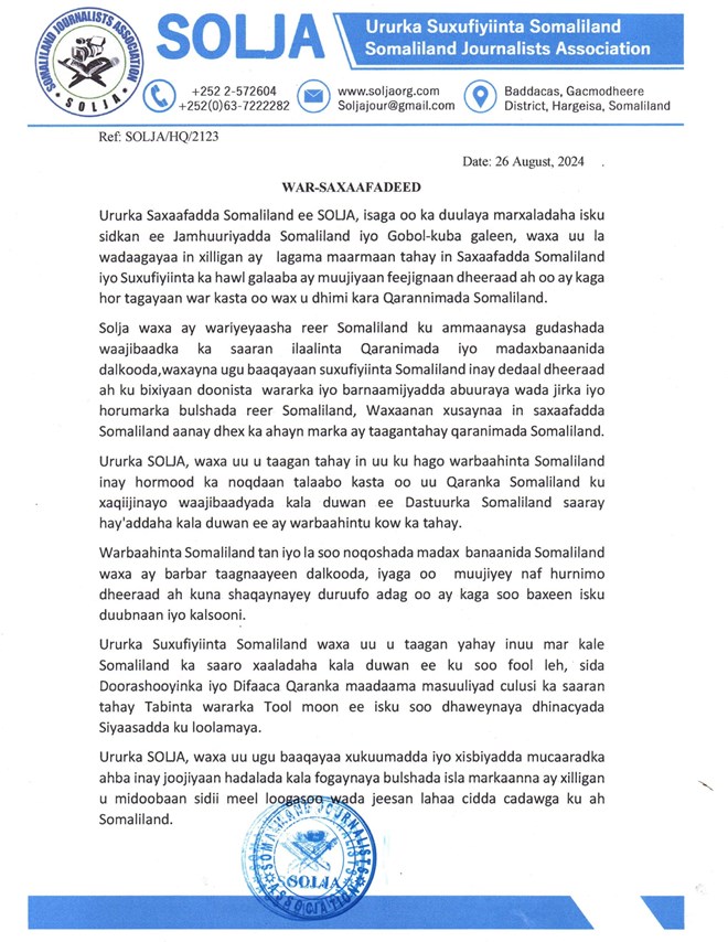 Isniin, Agoosto, 26, 2024 (HOL) - Ururka Saxafiyiinta Somaliland ee SOLJA, ayaa saxafiyiinta ugu baaqay in ay wararka iska hubsadaan isla markaana ay ka foojignaadan wararka waxyeelaynaya Somaliland.