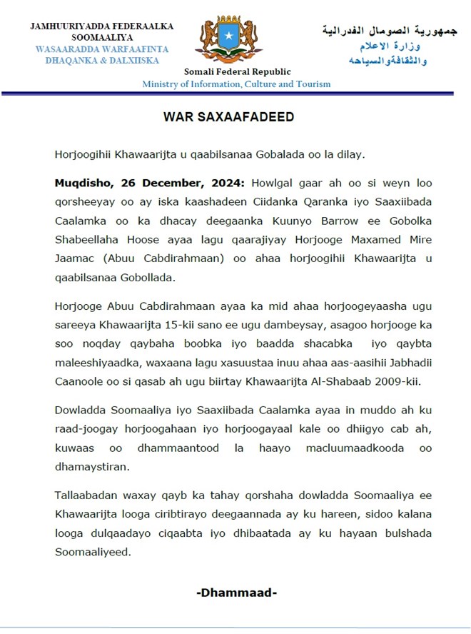 Khamiis, December 26, 2024 (HOL) - Dowladda Soomaaliya ayaa sheegtay inay kala qeyb qaadatay Saaxiibada Caalamka ee ka taageera Duqeymaha cirka ah howlgal gaar ah oo ka dhacay deegaanka Kuunyo Barrow ee Gobolka Shabeellaha Hoose laguna qaarajiyay Maxamed Mire Jaamac (Abuu Cabdiraxmaan) oo ahaa horjoogihii Al shabaab u qaabilsanaa Gobollada.