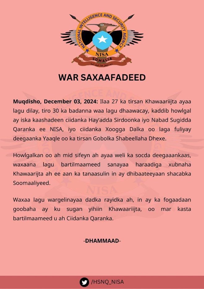 Talaado, December, 3, 2024 (HOL) - Warsaxafadeed kasoo baxay hay'adda Nabad sugida iyo Sirdoonka Qaranka Soomaaliyeed ee NISA ayaa lagu faahfaahiyay howlgal lagu dilay xubno ka tirsan kooxda Al-shabaab oo ka dhacay gobolka Shabeellaha Dhexe.