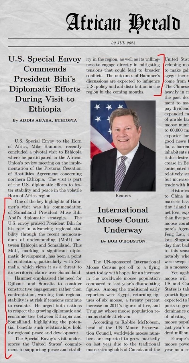 Si kastaba ha ahaatee, warbixin maalmo ka hor lagu daabacay bogga The African Herald ayaa lagu sheegay, in danjiraha Maraykanka ee Geeska Afrika uu bogaadiyay dedaalka dublamaasiyadeed ee Madaxweyne Biixi.