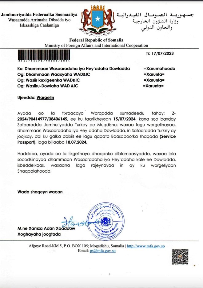 newsinsideGo’aankan oo dhaqan galay laga soo bilaabo 18-kii bishan July ayaa waxaa shaaca ka qaaday Xamza Aadan Hadow oo ah Xoghayaha Joogtada ee Wasaaradda Arrimaha Dibadda Soomaaliya, isagoo tixraacayay warqad ka soo baxday Safaaradda Turkiga ee Muqdisho.