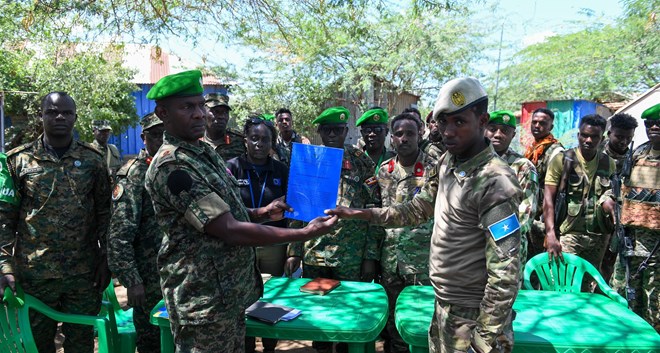 Howlgalka Midowga Afrika ayaa Soomaaliya kala baxay 5,000 oo askari, waxayna ku wareejiyeen 17 saldhig ciidan ciidamada ammaanka Soomaaliya, intii lagu guda jiray wajigii 1aad iyo 2-aad ee dhimista ciidamada ee sanadkii 2023-ka.