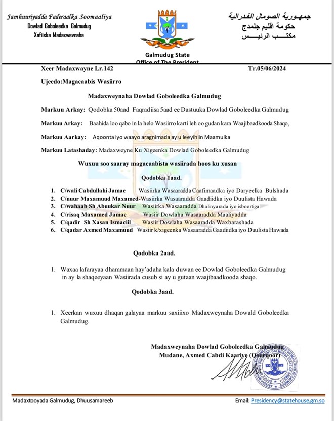 Arbaco, Juun, 5, 2024 (HOL) - Madaxweynaha maamulka Galmudug Axmed Cabdi Kaariye Qoor qoor ayaa magacaabay xubno ka mid noqonaya golaha Wasiiradda maamulka Galmudug.