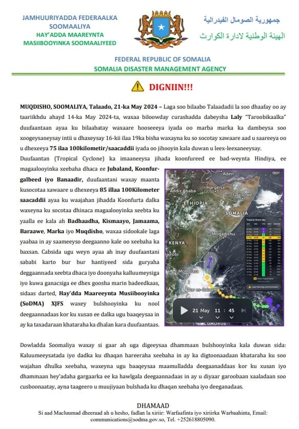 Talaado, May, 21, 2024 (HOL) - Hay'adda Maareynta Musiibooyinka ee dowladda Soomaaliya ayaa ka digtay loogu magacdaray 𝗟𝗮𝗹𝘆, taas oo ku soo wajahan magaaloyinka xeebaha dhaca, si gaar ah Muqdisho, Baraawe, Marka, Jamaame, kismaayo iyo Badhaadhe.