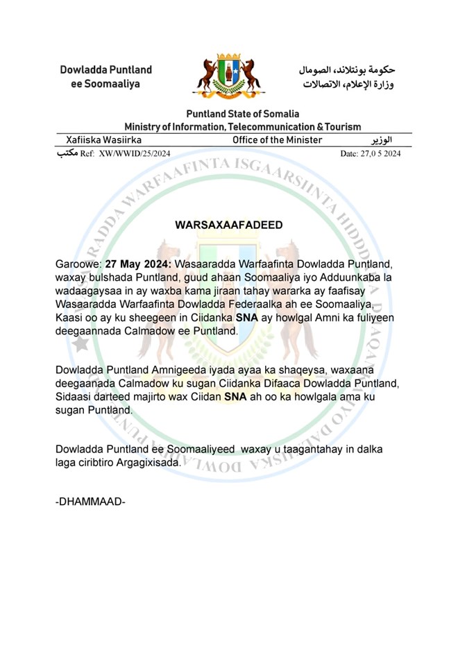 Isniin, May, 27, 2024 (HOL) - Dowlad goboleedka Puntland ayaa si adag uga horyimid war kasoo baxay dowladda fedderaalka Soomaaliya oo ku saabsanaa in ciidamada qalabka sida ee Soomaaliya oo kaashanaya saaxiibada caalamiga ah ay howlgal ka dhan ah Alshabaab ka fuliyeen degaanada Calmadow ee gobolka Sanaag.