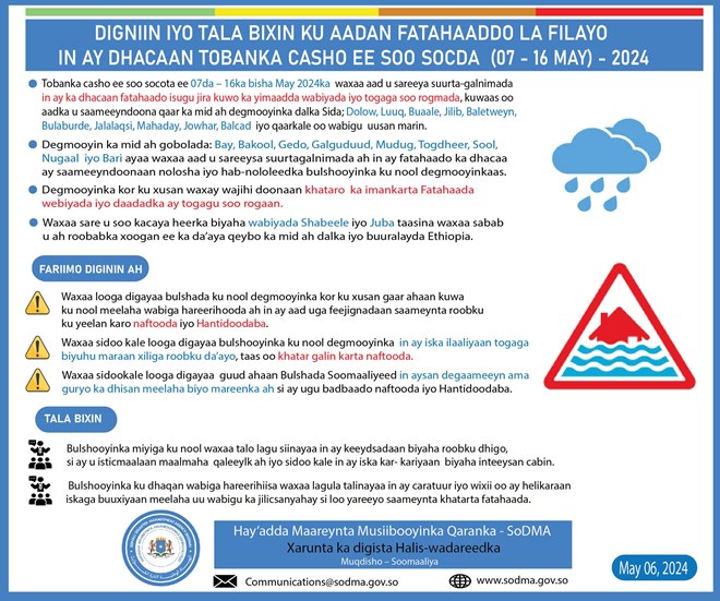 "Tobanka casho ee soo socota ee 07-da illaa 16-ka bisha May 2024-ka waxaa aad u sareeya suurta-galnimada in ay ka dhacaan fatahaado isugu jira kuwo ka yimaadda wabiyada iyo togaga soo rogmada, kuwaas oo aadka u saameeyndoona qaar ka mid ah degmooyinka dalka Sida; Doolow, Luuq, Bu’aale, Jilib, Beledweyne, Bula-burde, Jalalaqsi, Mahaday, Jowhar, Balcad iyo qaar kale oo webiga uusan marin" ayaa lagu yiri qoraalka kasoo baxay SODMA.