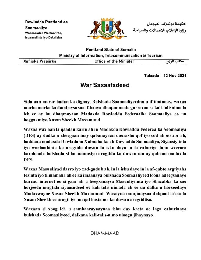 “Waxaa Masuuliyad darro iyo xad-gudub ah, in la isku dayo in la af-qabto argtiyaha tosinta iyo tilmamaha ah ee ka imaanaya bulshada Soomaaliyeed loona adeegsanayo burcad internet oo si gaar ah u beegsanaysa Masuuliyiinta iyo Shacabka ka soo horjeeda aragtida siyaasadeed ee kali-talis-nimada ah ee uu dalka u horseedayo Madaxwayne Xasan Sheekh Maxamuud. Waxayna muujinaysaa dulqaad la’aanta Xasan Sheekh ee aragti iyo maqal kasta oo ka duwan aragtidiisa,” ayay tiri wasaaradda warfaafinta Puntland.