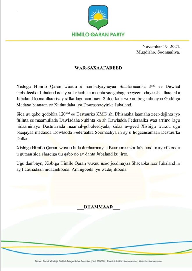 newsinside"Sida uu qabo qodobka 120ad ee Dastuurka KMG ah, Dhismaha laamaha xeer-dejinta iyo fulinta ee maamullada Dawladaha xubinta ka ah Dawladda Federaalka waa arrimo lagu nidaaminayo Dastuurrada maamul-goboleedyada, sidaa awgeed Xisbigu wuxuu ugu baaqayaa madaxda Dowladda Federaalka Soomaaliya in ay u hogaansamaan Dastuurka Dalka" ayaa lagu yiri War saxaafadeed kasoo baxay Xisbiga Himilo Qaran .