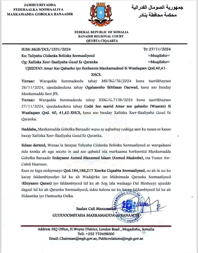 Hoos ka akhriso amarka Maxkamada gobolka Banaadir oo dhameystiran:-