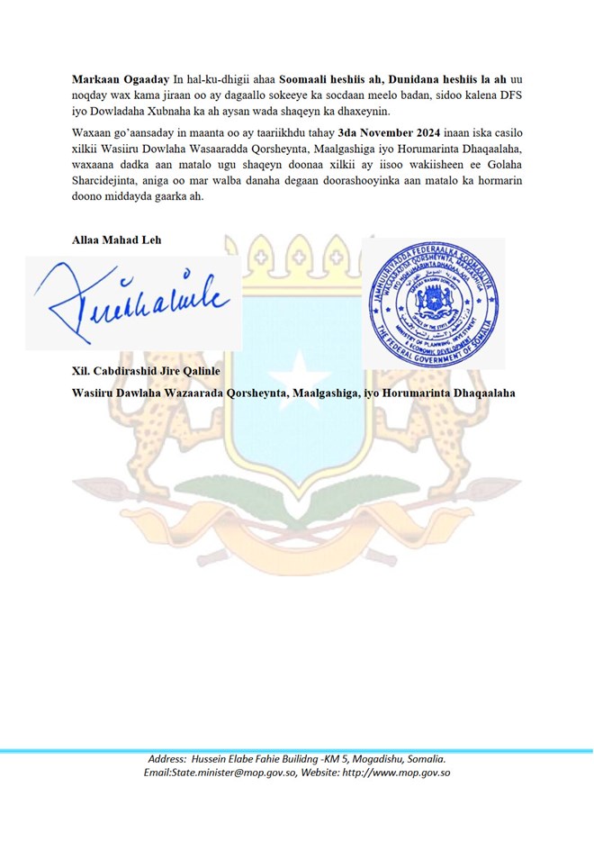 Axad, November, 3, 2024 (HOL) - Wasiiru dowlihii Wasaaradda Qorsheynta iyo Iskaashiga Caalamiga Cabdirashiid Jire Qalinle ayaa goordhaw shaaciyay inuu iscasilay, islamarkaana is casilaadiisa uu u gudbiyay Raysal Wasaare Xakuumadda Fedaraalka Soomaaliya Xamse Cabdi Barre.