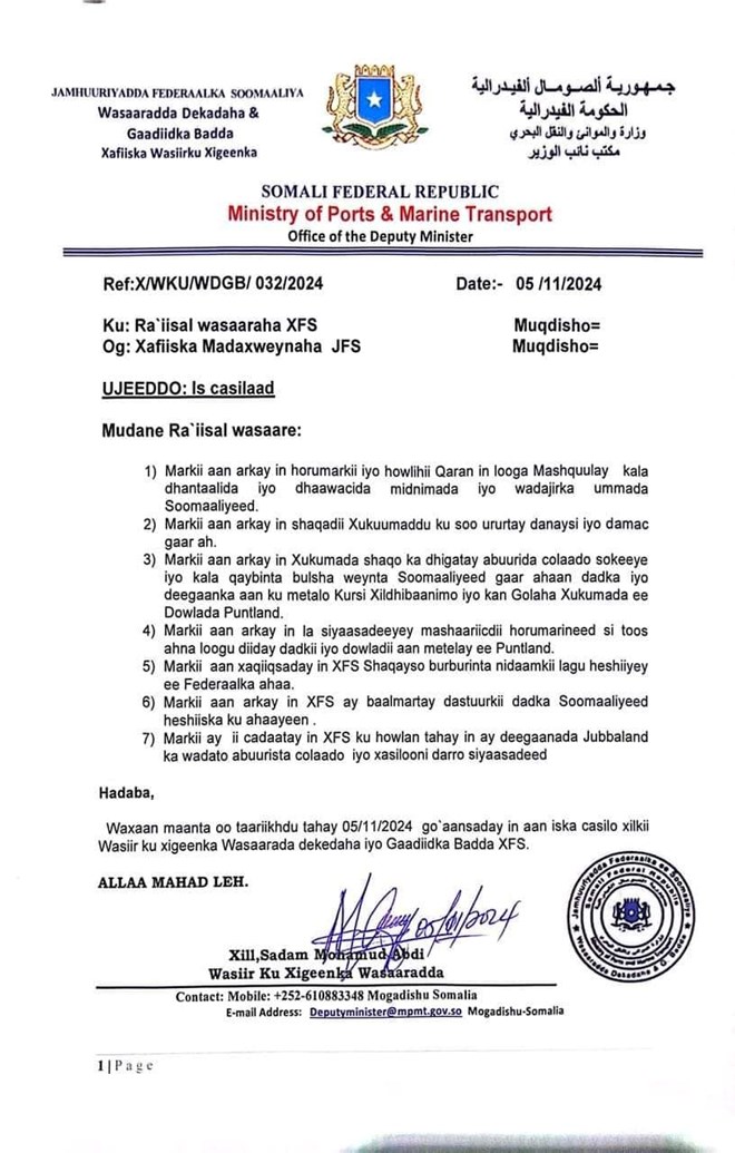 Arbaco, November, 6, 2024 (HOL) - Wasiir ku xigeenkii Wasaaradda Dekedaha iyo Gaadiidka Badda ee Xukuumadda Federaalka Soomaaliya Saadaam Maxamuud Cabdi ayaa xalay iska casilay xilka wasiirnimo, waxaana uu noqonayaa Wasiirkii sadexaad ee maalmo gudaheeda iska casila Xukuumadda Raysal Wasaare Xamse Cabdi Barre.