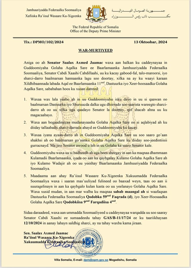 Axad, October, 13, 2024 (HOL) - Raysal wasaare ku xigeenka Xukuumadda Fedaraalka Soomaaliya Saalax Axmed Jaamac ayaa si adag uga horyimid talaabadii uu Shalay guddoomiyaha Aqalka sare uga xayuubiyay xubinimadii kursiga Golaha Aqalka sare.