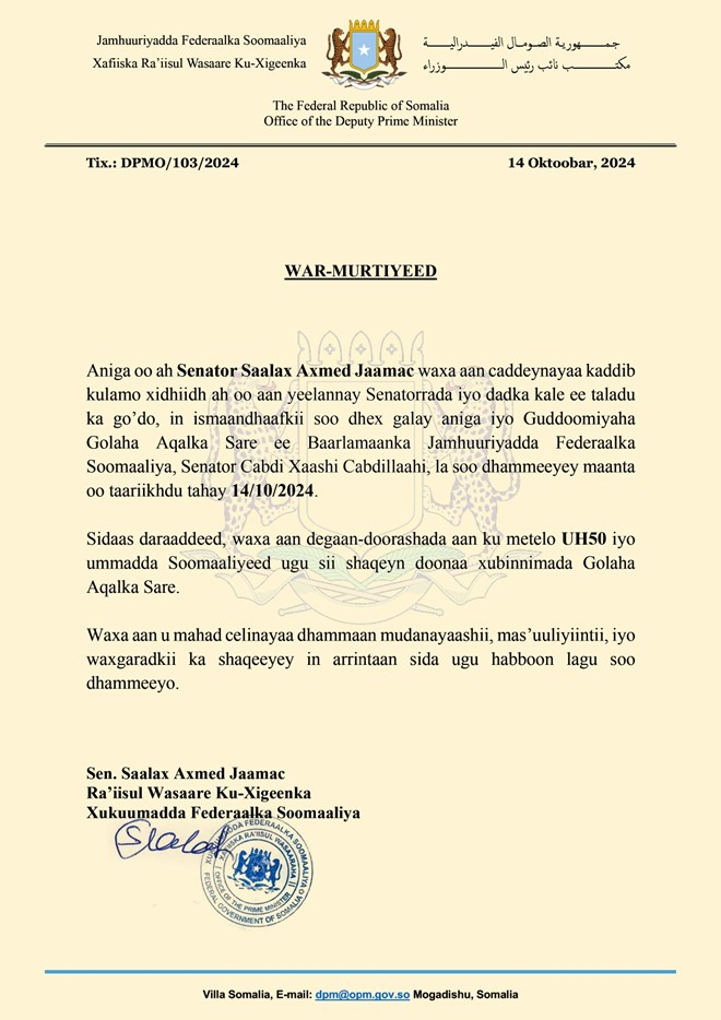 newsinsideWar qoraal ah oo uu soo saaray guddoomiye Cabdi Xaashi Cabdullaahi ayaa lagu sheegay inuu u tanaasulay Raysal wasaare ku xigeenka Xukuumadda kadib talo bixino uu sheegay iney uga yimaadeen dhinacyo dhexdhaxaadiyaal ah, wuxuuna shaaciyay in Saalax Axmed Jaamac uu sii wadan doono shaqadiisa Senatarnimo.