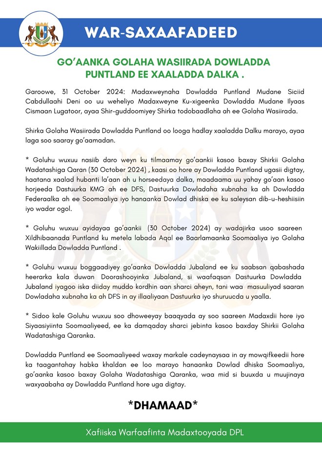 Khamiis, October, 31, 2024 (HOL) - Puntland ayaa sheegtay inay aad uga xun tahay go’aankii kasoo baxay shirkii Golaha Wadatashiga Qaran, iyadoo sheegtay in sii kordhinayso hubanti la’aanta ka jirta dalka, isla markaana uu ka hor imanayo dastuurka ku meel gaarka ah ee dawladda Faderaalka iyo dastuurka dawladdaha xubnaha ka ah.