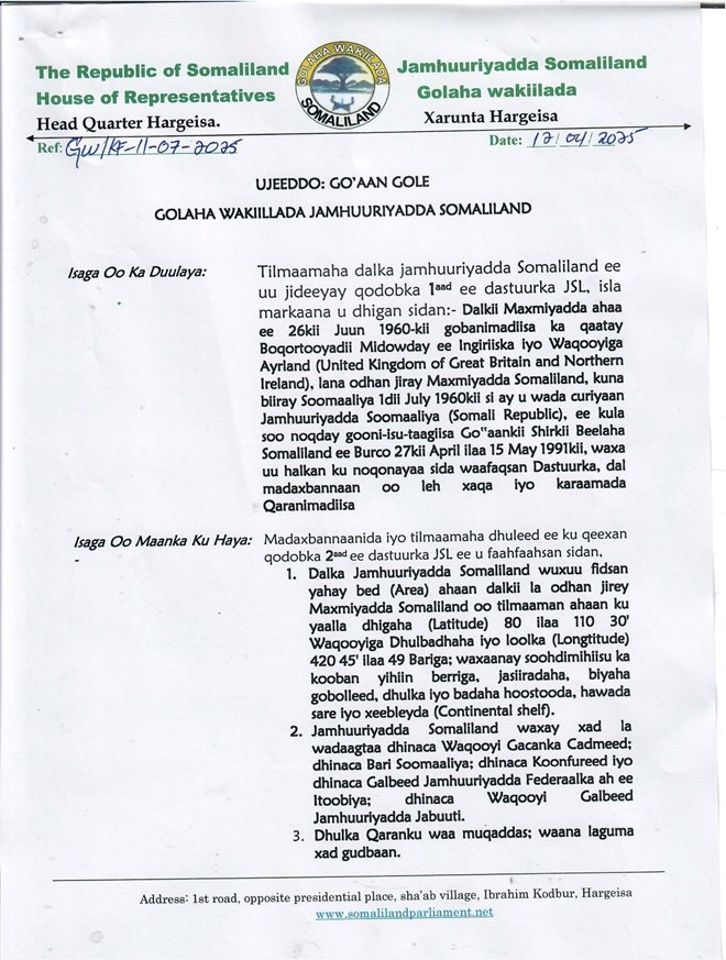 Go’aanka kasoo baxay Golaha ayaa lagu yidhi: "Golaha Wakiillada Jamhuuriyadda Somaliland wuxuu taageerayaa mawqifka xukuumadda JSL ka qaadatay imaanshaha Ra’iisul Wasaaraha Soomaaliya ee Degmada Laascaanood ee Gobolka Sool, taas oo uu goluhu ku tilmaamay faragelin qaawan oo ku ah madaxbannaanida iyo qaranimada JSL."