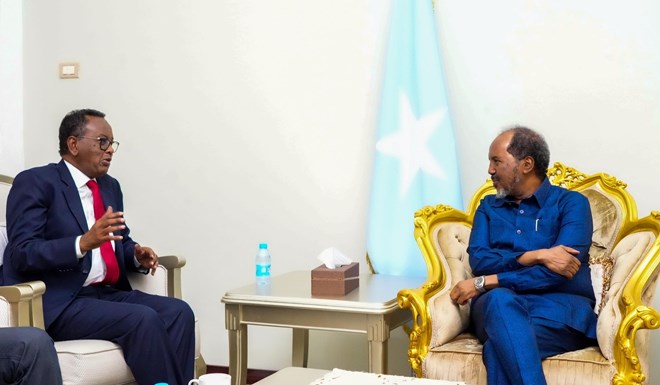 Axad, April 20, 2025 (HOL) - Madaxweynaha Soomaaliya Xasan Sheekh Maxamuud ayaa Madaxtooyada ku qaabilay Ra'iisul wasaarihii hore ee dalka Cabdi Faarax Shirdoon.