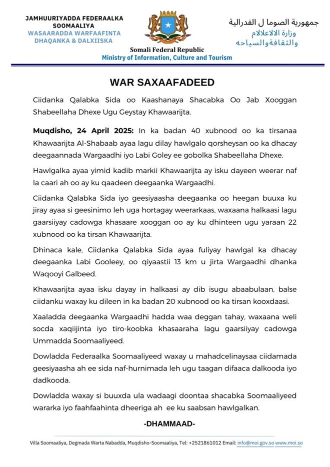Khamiis, April 24, 2025 (HOL) - Wasaaradda Warfaafinta ee Soomaaliya ayaa sheegtay in In ka badan 40 xubnood oo ka tirsanaa Al-Shabaab lagu dilay hawlgalo qorsheysan oo ka dhacay deegaannada Wargaadhi iyo Labigoley ee gobolka Shabeellaha Dhexe.