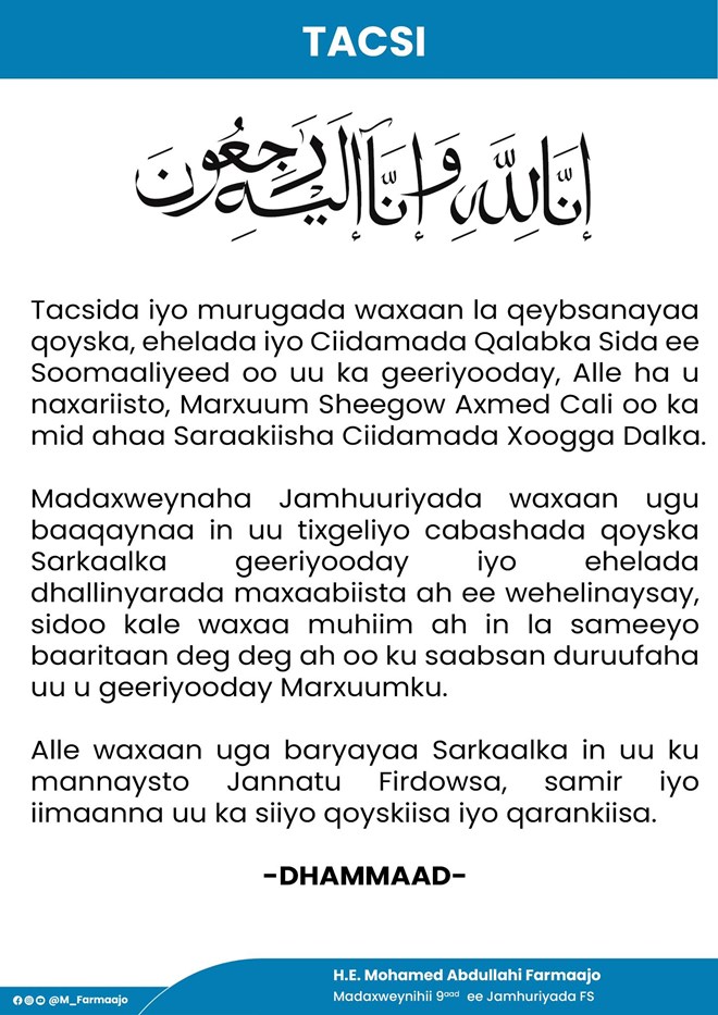 "Waxaa muhiim ah in la sameeyo baaritaan deg deg ah oo ku saabsan duruufaha uu u geeriyooday Marxuumku." Ayuu yiri Madaxweynihii hore ee Soomaaliya Maxamed Cabdullahi Farmaajo.