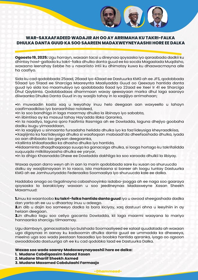 Talaado, Agoosto 19, 2025 (HOL) - Madaxweynayaashii hore ee Soomaaliya, Cabdiqasim Salad Xasan, Sharif Sheikh Axmed, iyo Maxamed Cabdullahi Farmaajo, ayaa si wadajir ah u soo saaray war-saxaafadeed ay uga digayaan Madaxweynaha hadda talada haya, Xasan Sheikh Maxamuud, tallaabooyinka lagu barakicinayo muwaadiniin danyar ah oo deganaa dhul dan guud.