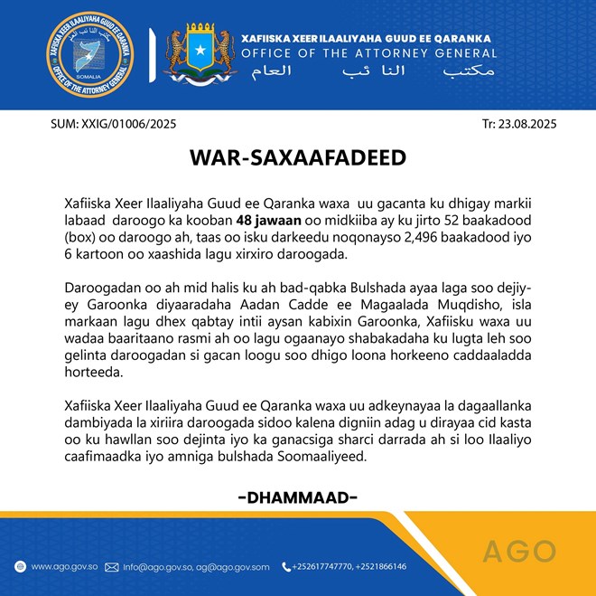 Sabti, Agoosto 23, 2025 (HOL) - Dowladda Fedaraalka Soomaaliya ayaa maanta markale shaacisay in gacanta ku dhigay Daroogo si qarsoodi ah lagu soo galinaayay gudaha dalka, taasoo lagu qabtay garoonka Diyaaradaha ee Muqdisho.