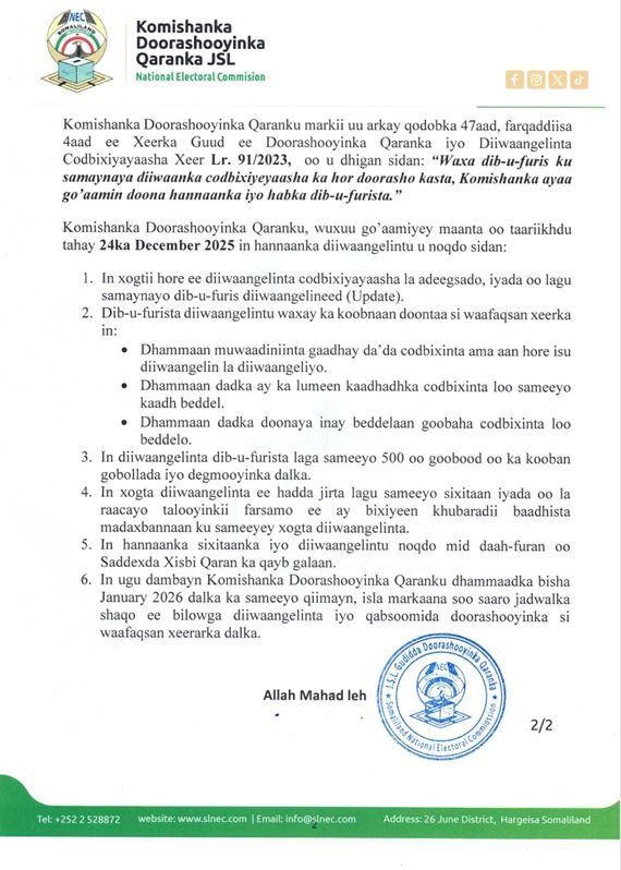 Arbaco, December 24, 2025 (HOL) - Komishanka Doorashooyinka Somaliland ayaa si rasmi ah ugu dhawaaqay in dib-u-furis lagu samaynayo diiwaanka codbixiyayaasha, taas oo xisbiyadu ay ku muransanaayeen qaabka loo qabanayo, iyada oo xisbiyada Kulmiye iyo Waddani ay doonayeen in kali ah la diwaangaliyo dadka aan hore isu-diwaangalin halka xisbiga Kaah uu rabay in dadka oo dhan dib loo diwaangaliyo.