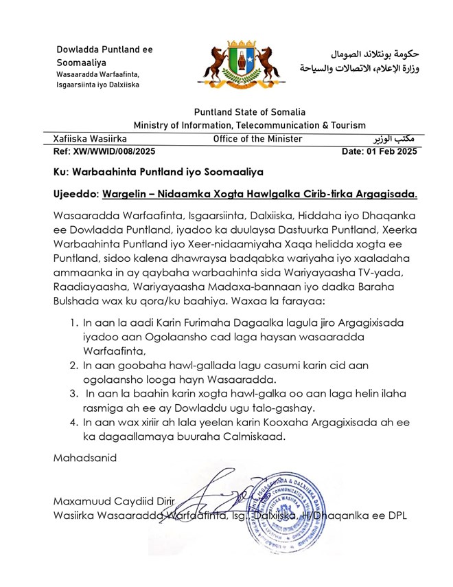 newsinsideWasiirka Warfaafinta maamulka Puntland, Maxamuud Caydiid Dirir, ayaa sheegay in go’aankani uu qeyb ka yahay amar guud oo lagu soo rogay guud ahaan saxaafadda Puntland.