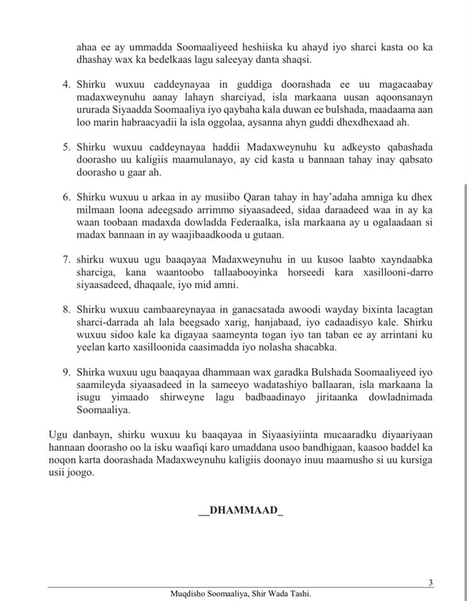 Sidoo kale waxa ay War saxaafadeedka Shirka laga soo saaray ay ku sheegeen in Madaxweynaha uu caadeystay mijo-xaabinta kala soocnaanta awoodaha dowladda, taasoo wiiqaysa hufnaanta iyo isla xisaabtanka hay'adaha dastuuriga ah, sida ku cad qodobka 3aad faqradiisa 4aad ee Dastuurka KMG ah ee JFS sidoo kale in Lacago sharci darro ah si joogta ah loogu soo rogo ganacsatada Gobolka Banaadir, taasoo sababtay in uu xirmo suuqii Bakaaraha.