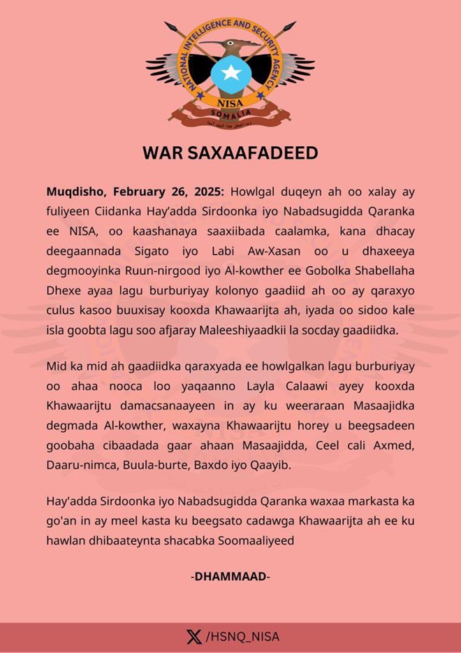 Arbaco, February 26, 2025 (HOL) - Taliska hay'adda Nabadsugida iyo Sirdoonka Qaranka Soomaaliyeed ee NISA ayaa goordhaw shaaciyay in duqeyn lagu burburiyay gaadiid qaraxyo kasoo buuxiyeen kooxda Al-shabaab oo ay doonayeen iney ku weeraraan deegaanka AlKowsar ee gobolka Shabeellaha Dhexe.