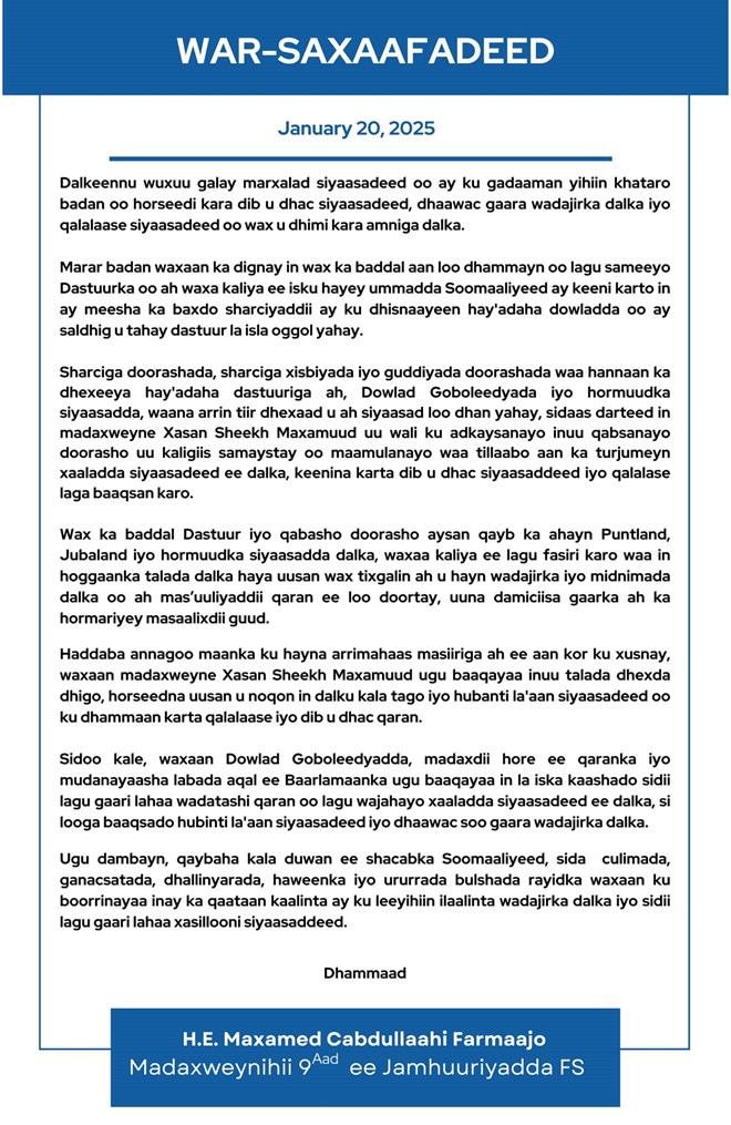 "Wax ka baddal Dastuur iyo qabasho doorasho aysan qayb ka ahayn Puntland, Jubaland iyo hormuudka siyaasadda dalka, waxaa kaliya ee lagu fasiri karo waa in hoggaanka talada dalka haya uusan wax tixgalin ah u hayn wadajirka iyo midnimada dalka oo ah mas'uuliyaddii qaran ee loo doortay, uuna damiciisa gaarka ah ka hormariyey masaalixdii guud." ayaa lagu yiri war saxafadeedka uu soo saaray Madaxweynihii hore ee Soomaaliya.