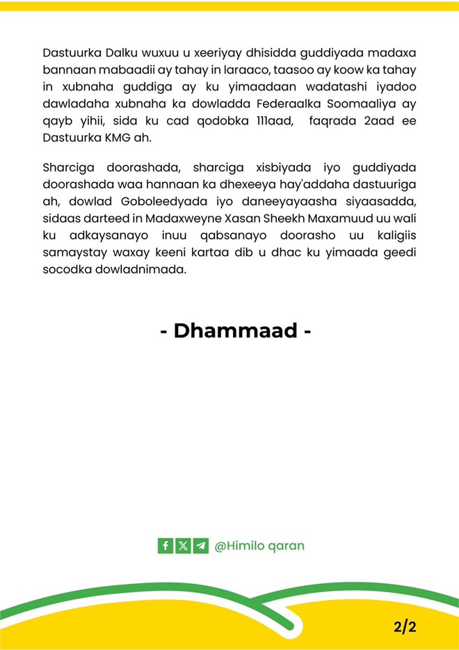 newsinsideWar saxaafadeedka Xisbiga Himilo Qaran waxaa lagu yiri "Xisbigu wuxuu marar badan ka digay wax-ka- beddelka Dastuurka KMG ah oo aan loo marin habraacyadii uu tilmaamayey cutubka 15aad ee dastuurka. Go'aannada ka soo fula hay'addaha dowladda waa inay ahaadaan kuwo ku dhisan sharci iyo go'aanno gaaristooda loo maray sida ku cad Qodobka 33aad ee Dastuurka KMG ah."
