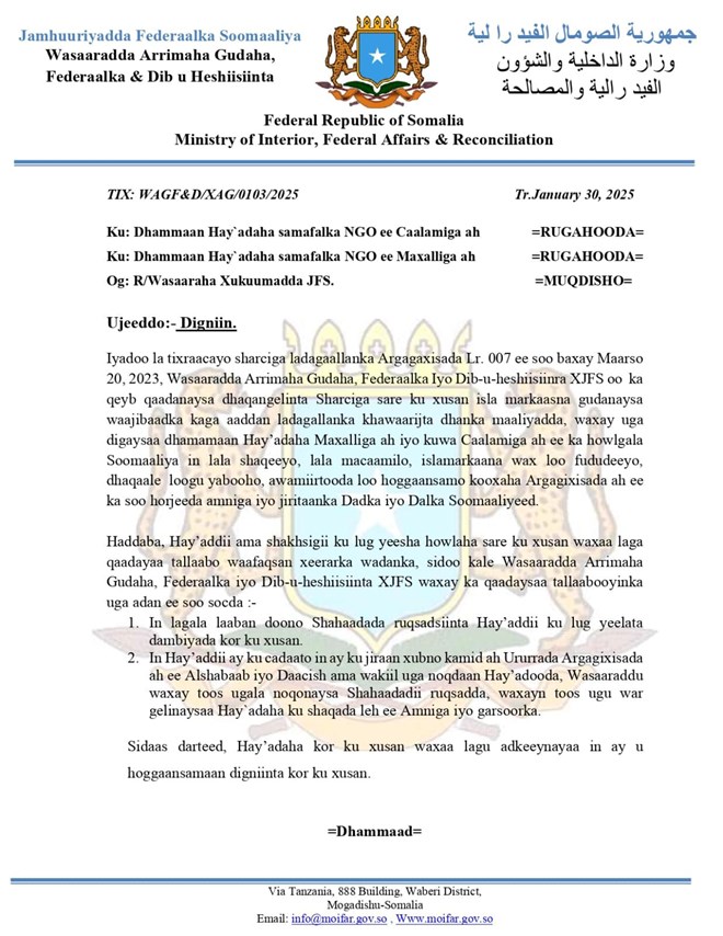 Khamiis, January 30, 2025 (HOL) - Wasaaradda arrimaha gudaha iyo dib u heshiisiinta Xukuumadda Fedaraalka Soomaaliya ayaa soo saartay amaro culus oo ku socda hay'addaha Maxaliga ah iyo kuwa Caalamiga ah ee ka howlgala guud ahaan dalka.