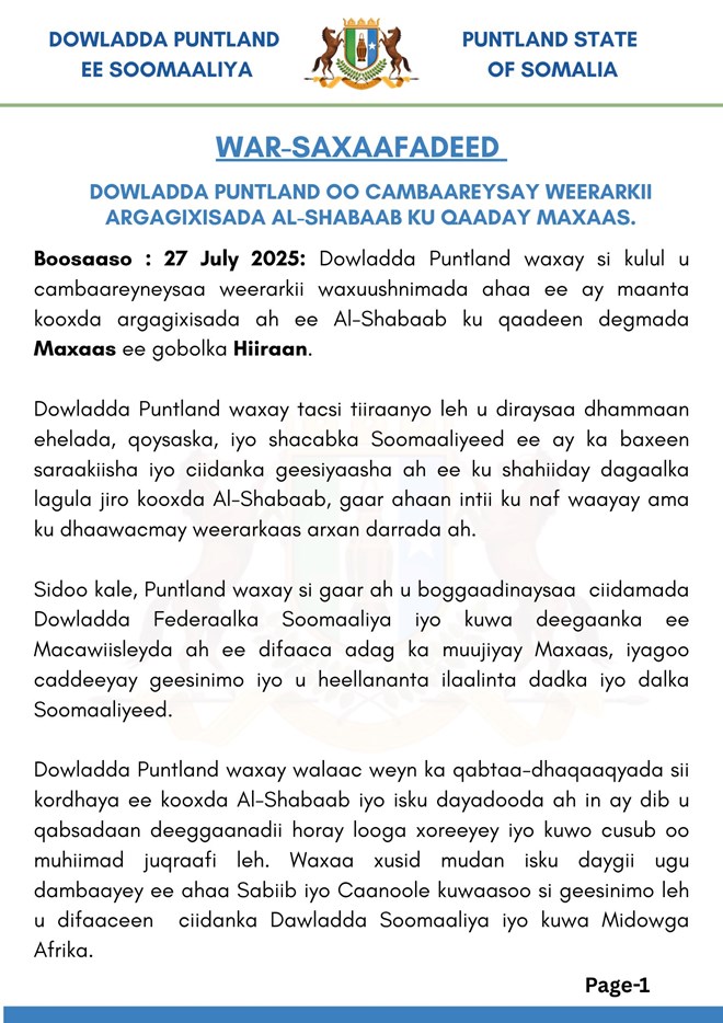 Isniin, Luulyo 28, 2025 (HOL) - Puntland ayaa cambaareysay weerarkii kooxda Al-Shabaab ay shalay kula wareegtay degmada Maxaas ee gobolka Hiiraan, kaas oo sababay khasaare naf iyo maalba leh.