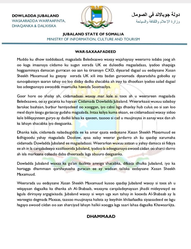 Hoos ka akhriso Warsaxafadeedka kasoo baxay Jubbaland oo dhameystiran:-