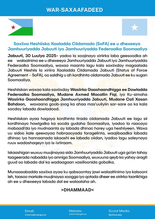 Arbaco, Luulyo 30, 2025 (HOL) - Dowladaha Soomaaliya iyo Jabuuti ayaa maanta magaalada Jabuuti si rasmi ah u kala saxiixday heshiis lagu kordhinaayo ciidamada dowladda Jabuuti ka jooga gudaha dalka Soomaaliya.