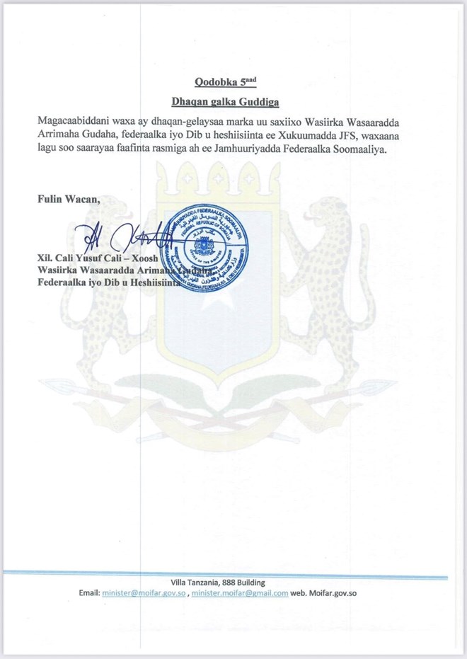 Sabti, Luulyo 5, 2025 (HOL) - Wasiirka Wasaaradda Arrimaha Gudaha iyo Dib u Heshiisiinta Xukuumadda Federaalka Soomaaliya Cali Yuusuf Cali Xoosh ayaa maanta wareegto uu soo saaray si rasmi ah ugu magacaabay guddiga farsamo ee dhameystirka maamul goboleedka SSC Khaatumo.