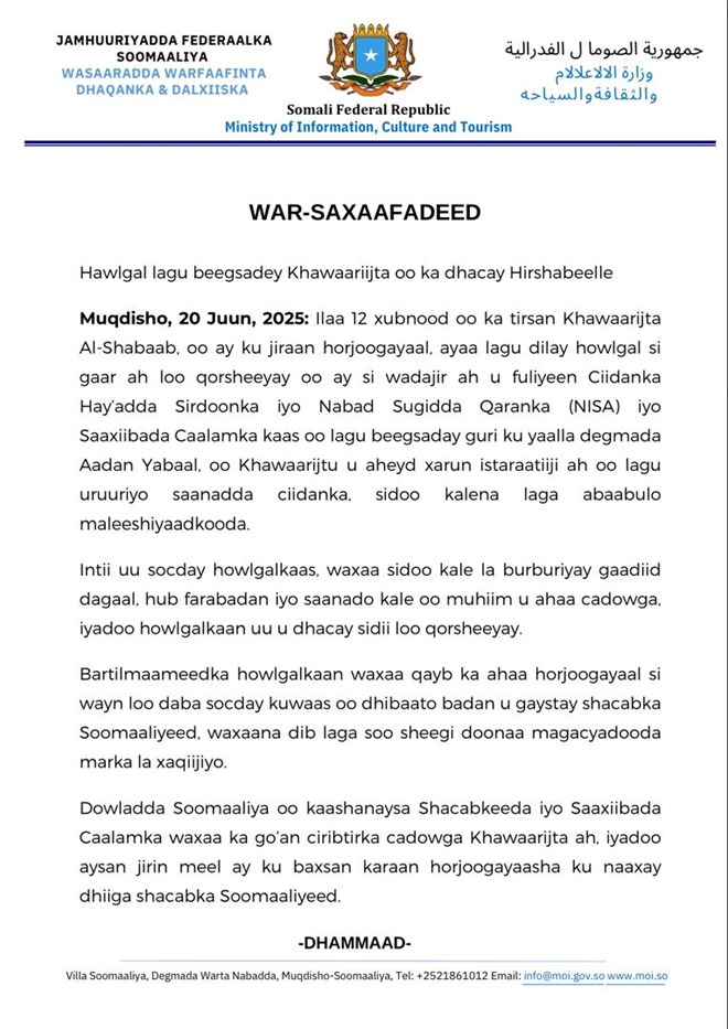 Jimco, Juun 20, 2025 (HOL) - Wasaaradda Warfaafinta Xukuumadda Fedaraalka Soomaaliya ayaa faahfaahin dheeraad ah ka bixisay howlgal qorsheysn oo gudaha degmada Aadan Yabaal ka fuliyeen ciidanka Nabadsugida iyo Sirdoonka Qaranka oo kaashanaya kuwa Saaxiibada Caalamka.