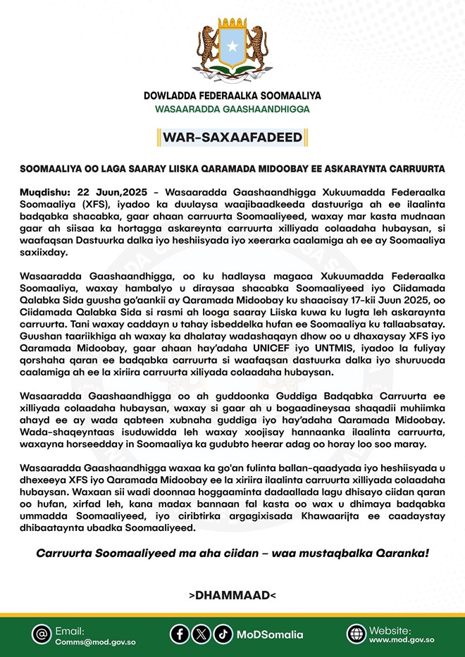 newsinside"Wasaaradda Gaashaandhigga, oo ku hadlaysa magaca Xukuumadda Federaalka Soomaaliya, waxay hambalyo u diraysaa shacabka Soomaaliyeed iyo Ciidamada Qalabka Sida guusha go'aankii ay Qaramada Midoobay ku shaacisay 17-kii Juun 2025, 00 Ciidamada Qalabka Sida si rasmi ah looga saaray Liiska kuwa ku lugta leh askaraynta carruurta."ayaa lagu yiri war saxafadeedka Wasaaradda.