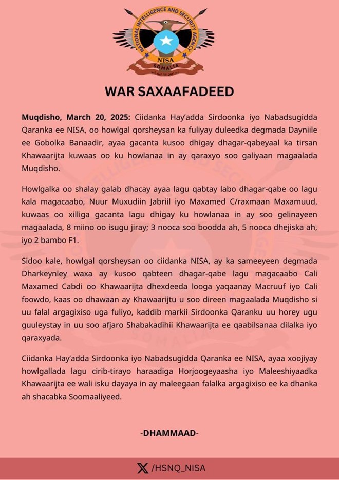 Khamiis, Maarso 20, 2025 (HOL) - War kasoo baxay Hay'adda Sirdoonka Qaranka Soomaaliya ayaa lagu sheegay in Ciidanka Hay'adda Sirdoonka iyo Nabadsugidda Qaranka ee NISA, oo howlgal qorsheysan ka fuliyay duleedka degmada Dayniile ee Gobolka Banaadir ay gacanta kusoo dhigeen dhagar-qabeyaal ka tirsan Al shabaab kuwaas oo ku howlanaa in ay qaraxyo soo galiyaan magaalada Muqdisho.