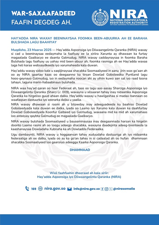 Axad, Maarso 23, 2025 (HOL) - Warsaxaafadeed ay soo saartay hay’adda aqoonsiga iyo diiwaangelinta dowladda Federaalka Soomaaliya ee NIRA ayaa lagu beeniyay eedeymo loo jeediyay hay'adda oo la xariiray in degmooyin ka tirsan Puntland ay raacisay Galmudug.