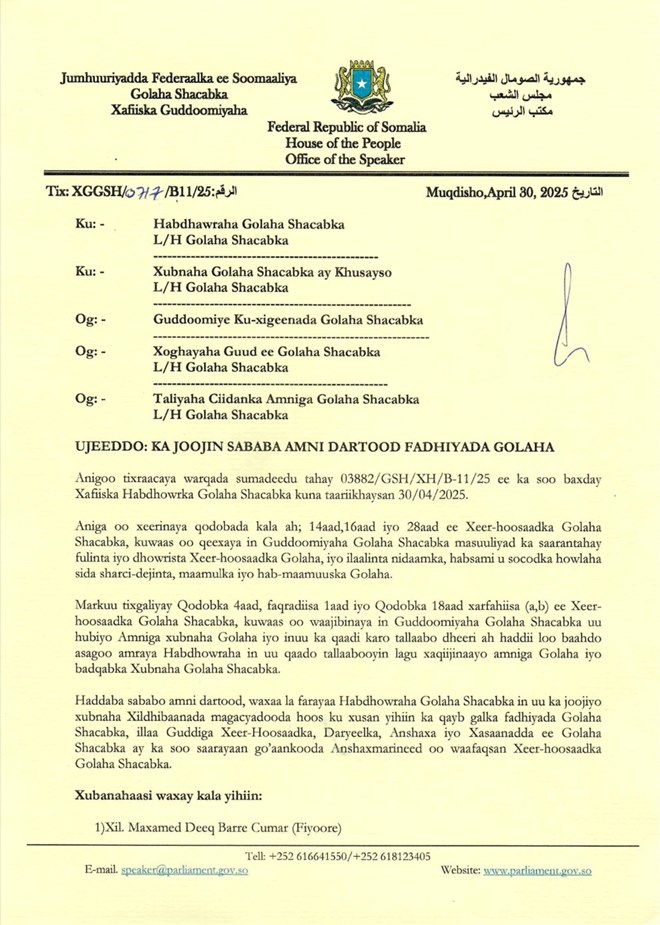 "Aniga oo xeerinaya qodobada kala ah; 14aad, 16aad iyo 28aad ee Xeer-hoosaadka Golaha Shacabka, kuwaas oo qeexaya in Guddoomiyaha Golaha Shacabka masuuliyad ka saarantahay fulinta iyo dhowrista Xeer-hoosaadka Golaha, iyo ilaalinta nidaamka, habsami u socodka howlaha sida sharci-dejinta, maamulka iyo hab-maamuuska Golaha." Ayuu ku yiri qoraalka uusoo saaray.