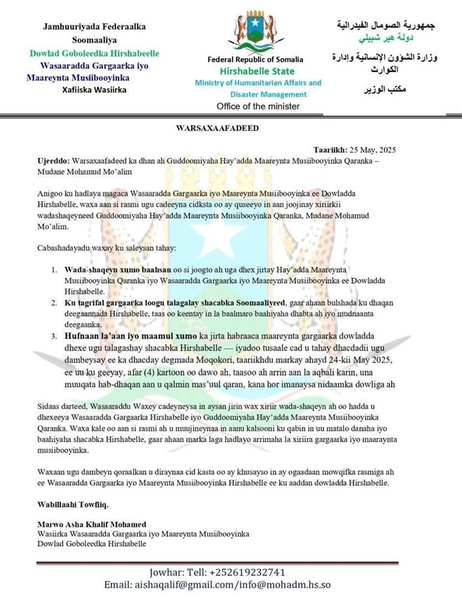 Axad, May 25, 2025 (HOL) - Warsaxafadeed kasoo baxay Wasaaradda Gargaarka iyo Maareynta Masiibooyinka ee maamulka Hirshabelle ayaa lagu shaaciyay in Wasaaradda si rasmi ah u jartay xiriirkii wada shaqeynta ee kala dhexeeysay Hay’adda Maareynta iyo Musiibooyinka Qaranka ee dowladda Soomaaliya.