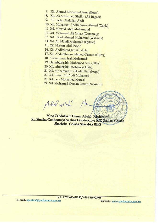 Warqadaan ayaa waxaa ku qornaa liiska 24ka Xildhibaan ee fadhiyada Golaha laga hakiyay oo iskugu jira mucaarad iyo muxaafad waxaana horey ay uga sameeyeen Golaha shacabka arbushaad inuu furmi waayo fadhiga mudanayaasha.