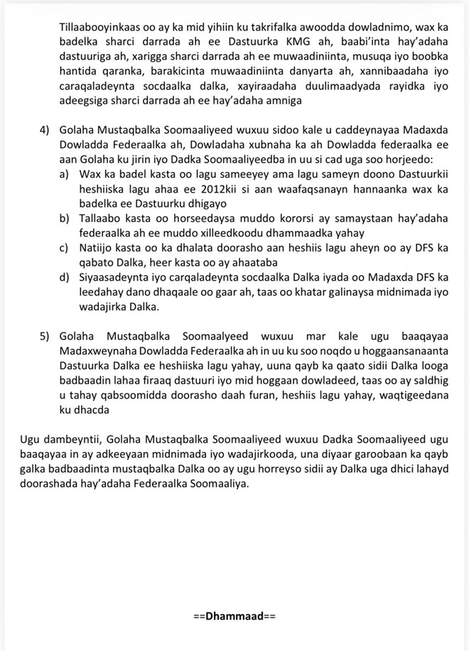 Golaha Mustaqbalka Soomaaliyeed oo ka digay tallaabooyin lagu sheegay inay halis ku yihiin dowladnimada iyo hanaanka Federaalka