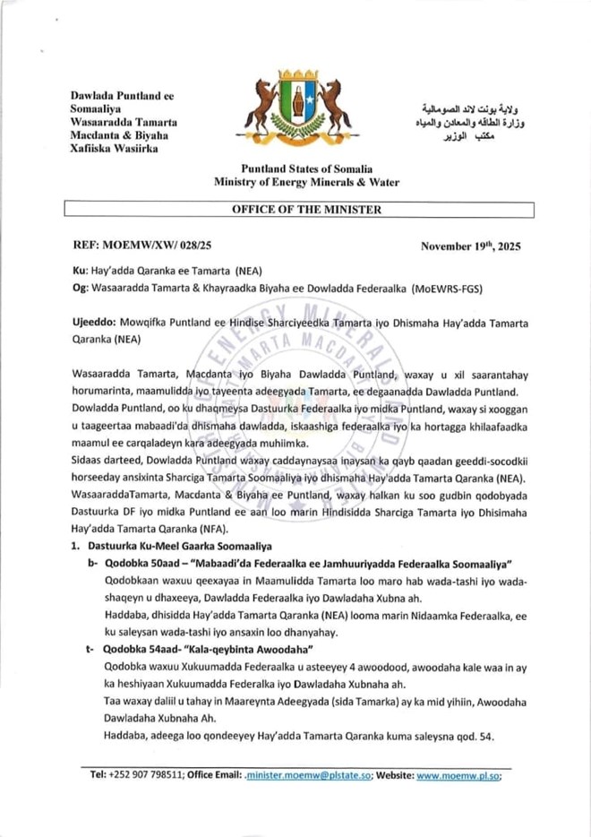 Khamiis, November 20, 2025 (HOL) - Puntland ayaa sheegtay in aysan qayb ka ahayn  ansixinta Sharciga Tamarta Soomaaliya iyo dhismaha Hay’adda Tamarta Qaranka (NEA), iyadoo sheegtay in arrintaasi ay ka hor imaanayso Dastuurka Federaalka iyo kan Puntland.