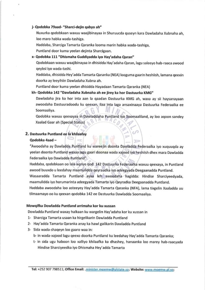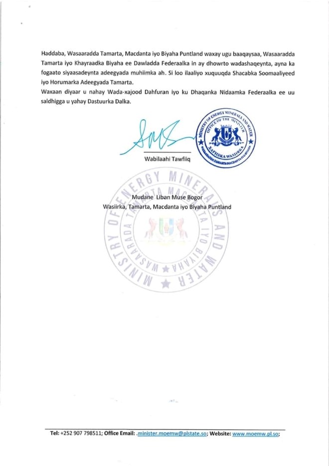 Wasaaradda Tamarta Puntland ayaa ku caddeysay warqaddeeda saddex qodob oo ah go’aanka rasmiga ah ee Dowladda Puntland: