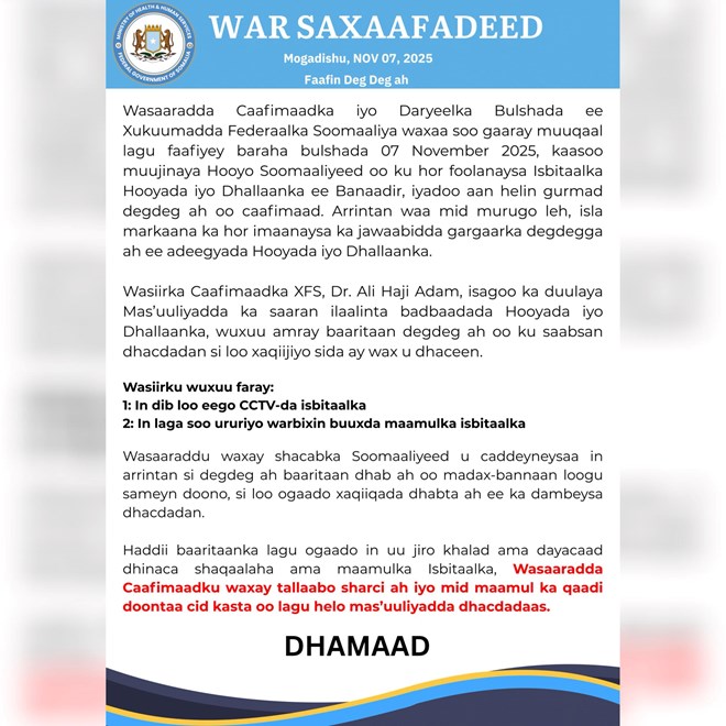 War-saxaafadeed kasoo baxay Wasaaradda Caafimaadka maanta oo ay taariikhdu tahay 07 November 2025, ayaa lagu sheegay in Wasiirka Caafimaadka XFS, Dr. Ali Haji Adam, uu amar ku bixiyay in si degdeg ah dib loogu eego CCTV-da isbitaalka, isla markaana laga soo ururiyo warbixin buuxda oo ka timaadda maamulka isbitaalka si loo xaqiijiyo sida ay wax u dhaceen.