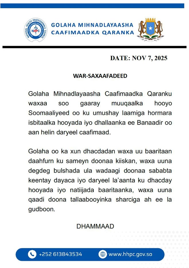 Dhinaca kale, Golaha Mihnadlayaasha Caafimaadka Qaranka ayaa soo saaray bayaan ay ku sheegayaan inuu gaaray muuqaalka hooyada Soomaaliyeed oo ku umushay laamiga hormara isbitaalka hooyada iyo dhallaanka ee Banaadir oo aan helin daryeel caafimaad.
