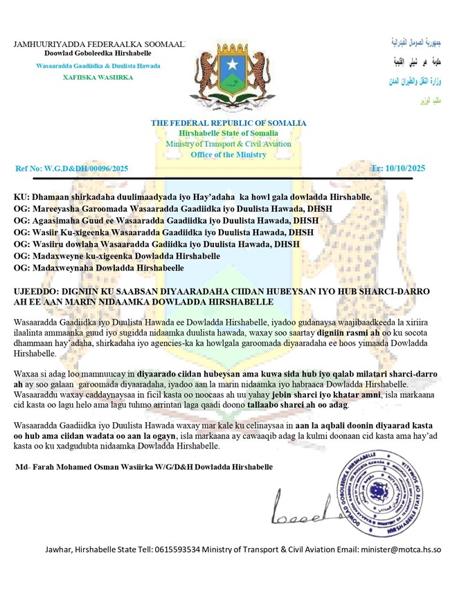 Sabti, October 11, 2025 (HOL) - Warsaxafadeed kasoo baxay Wasaaradda Gaadiidka iyo Duulista Hawada maamulka Hirshabeelle ayaa lagu mamnuucay in garoomada diyaaradaha deegaanada Hirshabeelle kasoo dagaan diyaarado hub iyo ciidan sida.