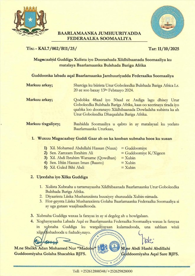 Sabti, October 11, 2025 (HOL) - Soomaaliya ayaa markii ugu horreysay ku biiraysa Baarlamaanka Ururka Bulshada Bariga Afrika (EALA), taas oo la sheegay in ay qeyb ka tahay dadaallada dowladda federaalka ee ku aaddan in dalku si buuxda uga mid noqdo urur goboleedkan.